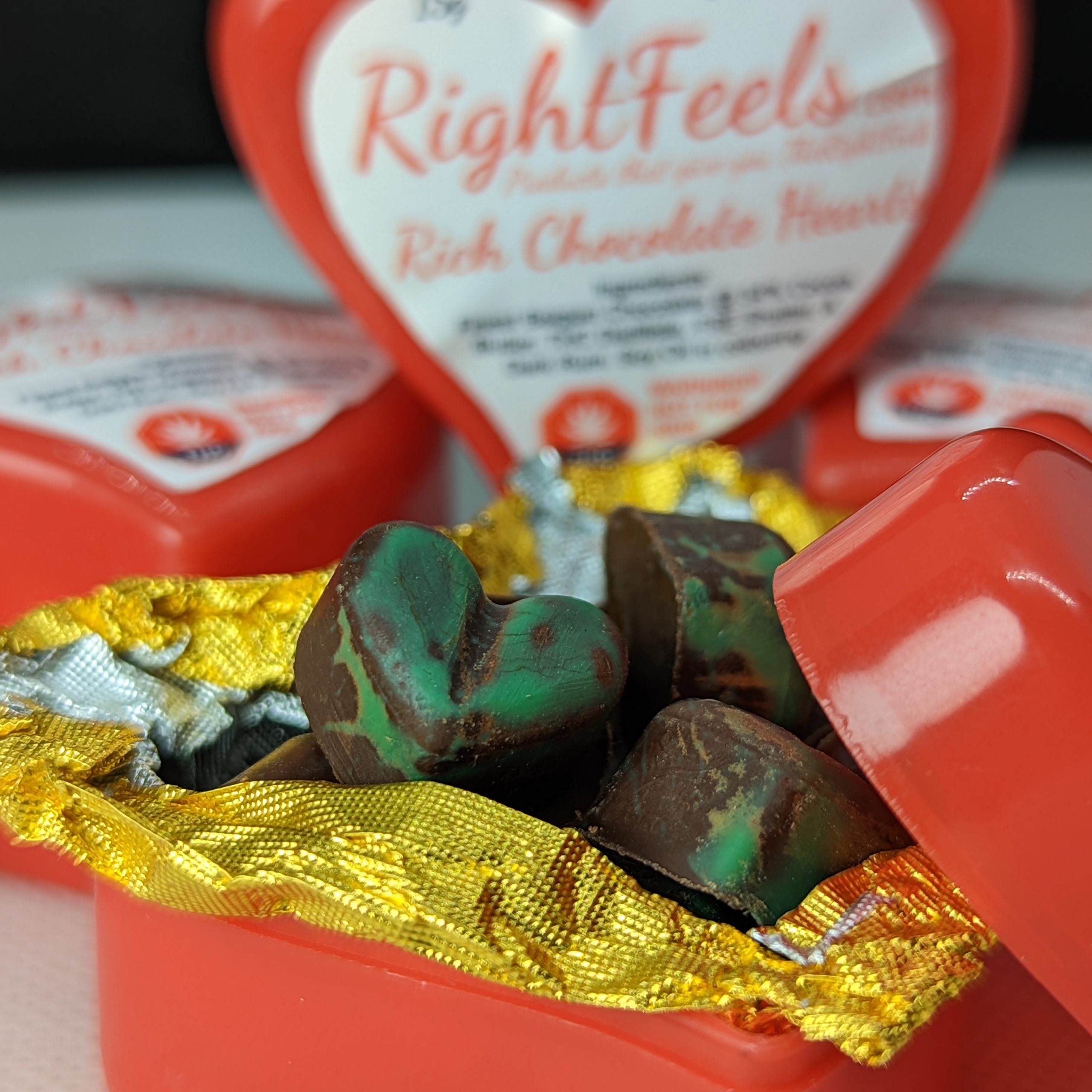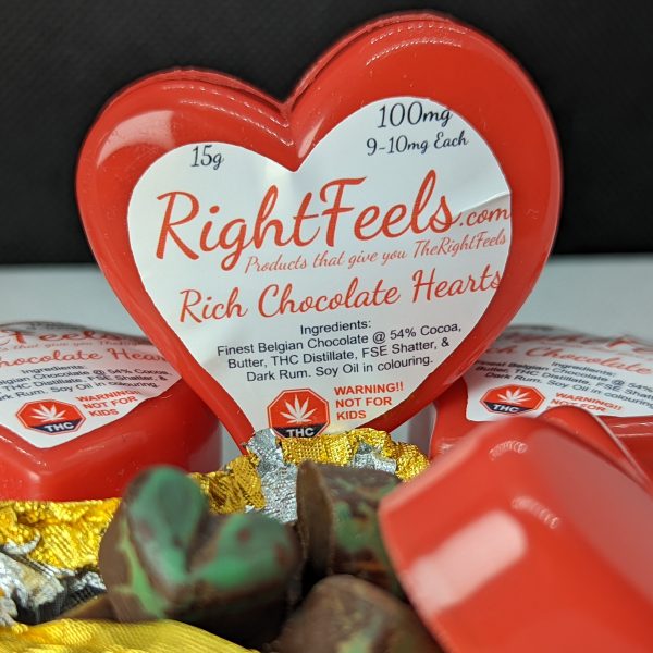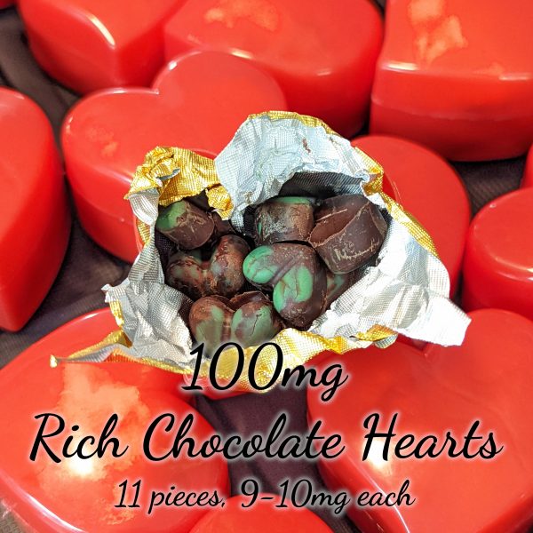 11 THC Chocolate Hearts in this reusable container! Each one has about 9-10mg of FSE THC carefully infused into it!