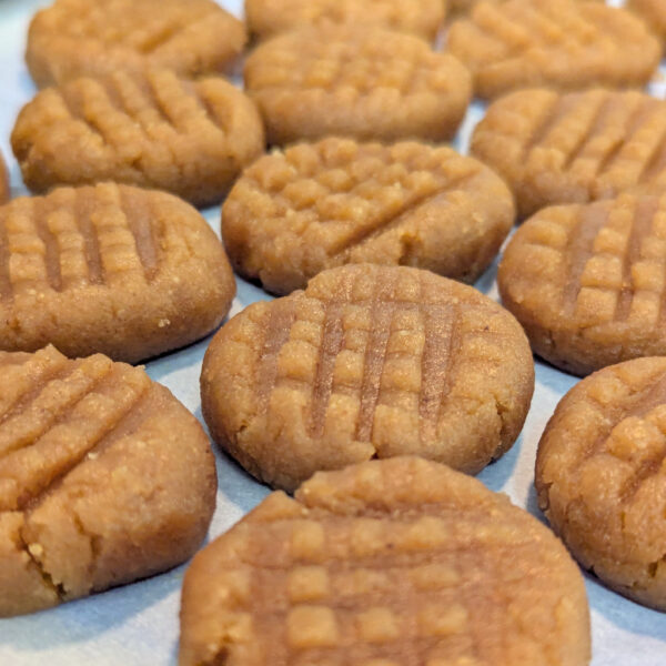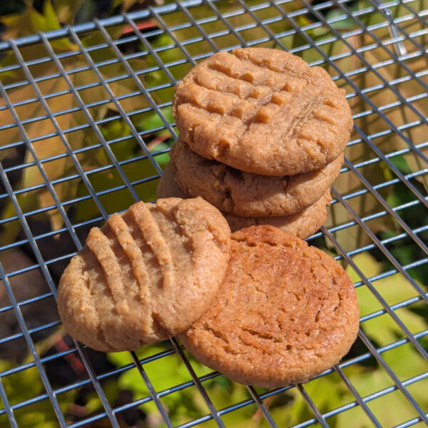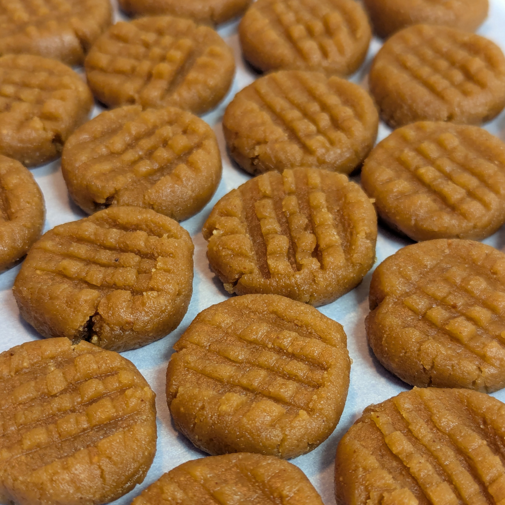 We start with natural peanut butter and blend it with a perfectly measured stevia/erythritol sweetener for just the right balance of flavor and chew. We add brown eggs, real vanilla, sunflower oil, a pinch of salt, baking soda, and a touch of xanthan gum for that bakery-style texture.