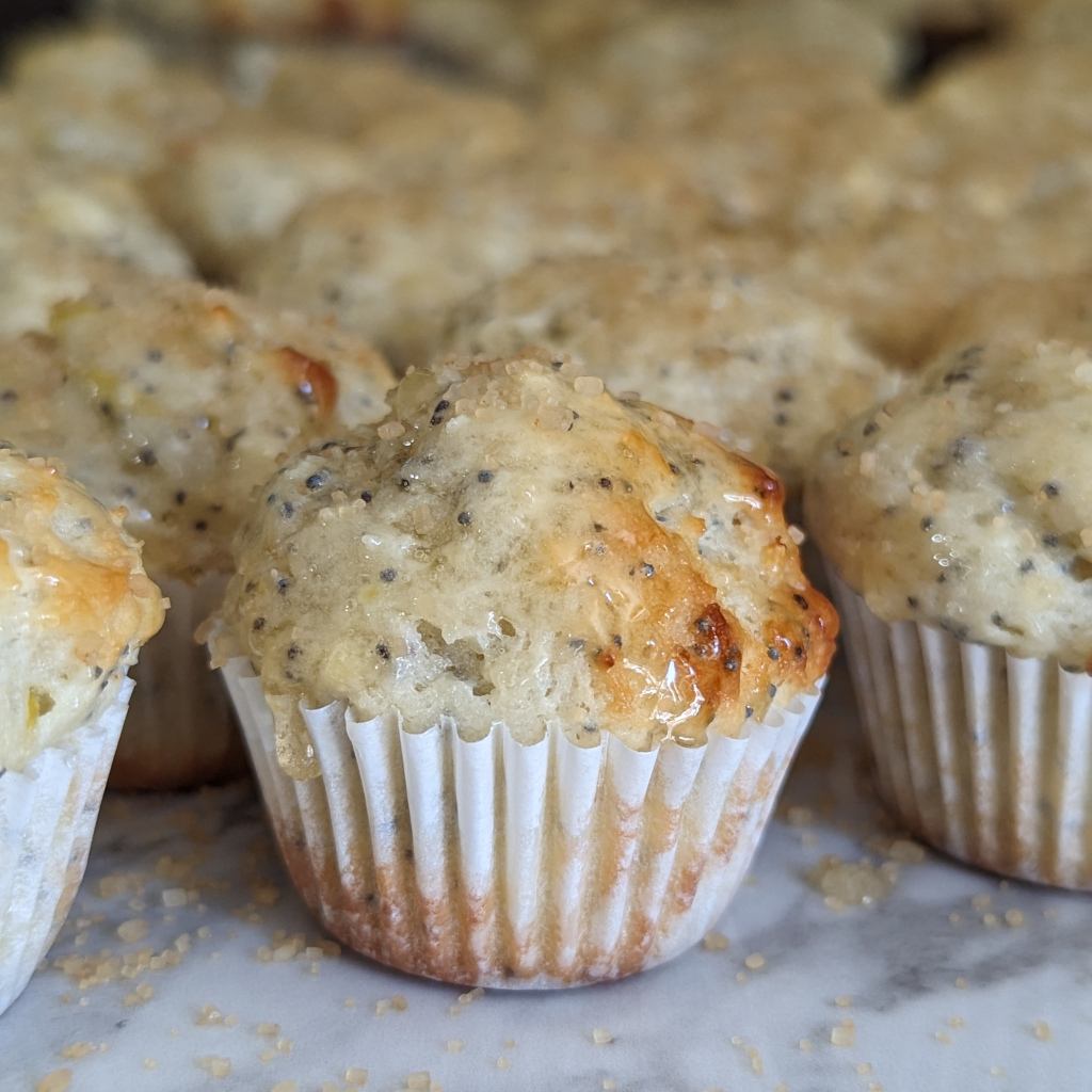 These Lemon Poppy Seed Muffins are perfectly sweetened and tender with a tart lemon glaze and sprinkling of coarse RAW sugar!
